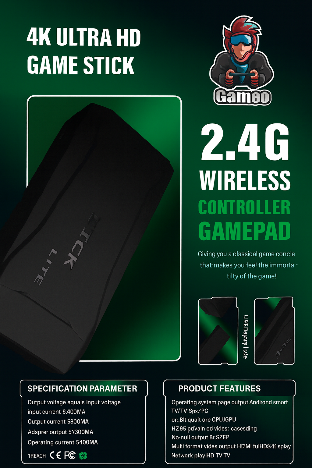 4K Ultra HD Wireless Game Stick Lite | 2.4G Dual Gamepad Console | Plug & Play TV Retro Gaming Device (Built-in 20,000+ Classic Games)