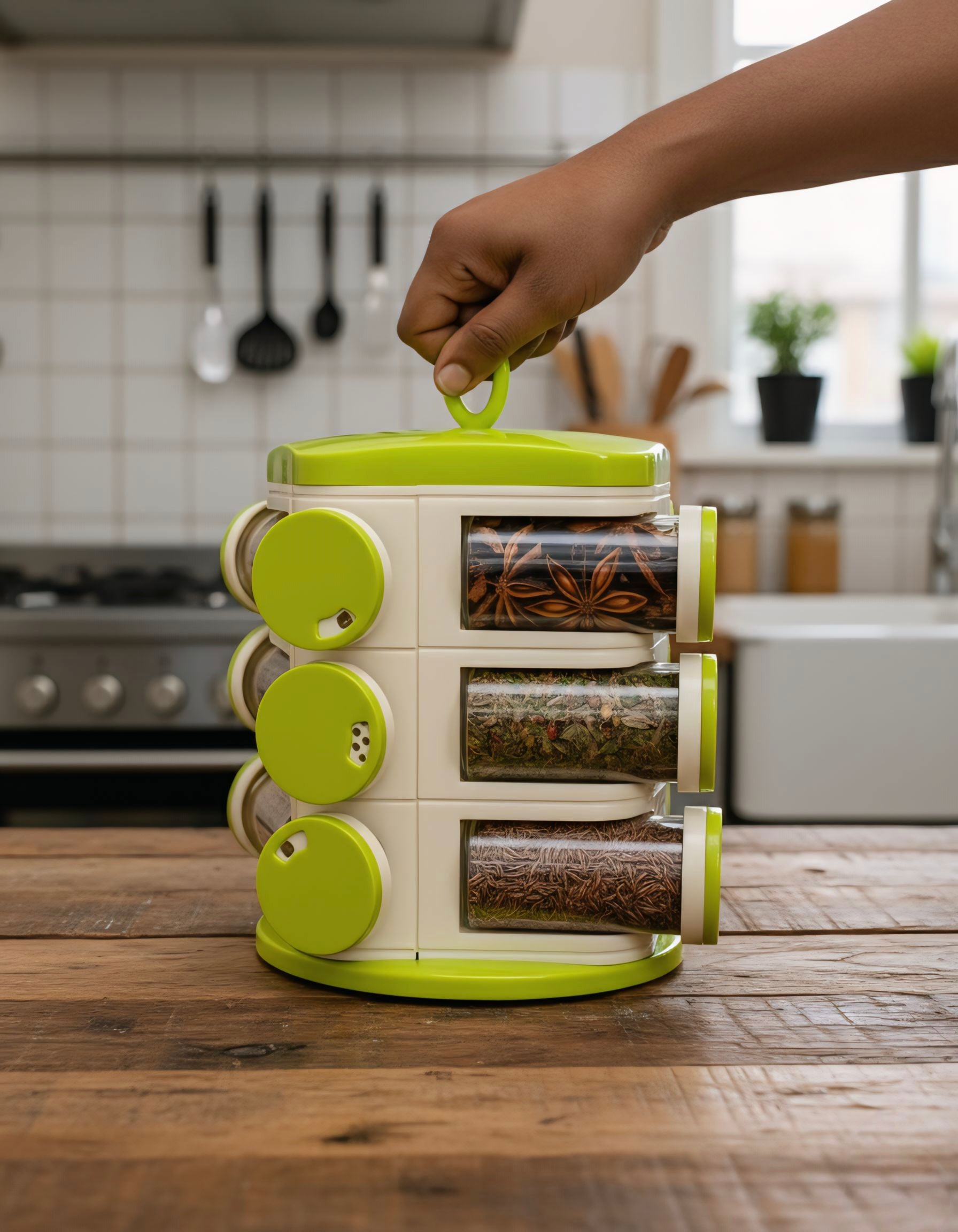 Keep your kitchen organized with the Store’n’More 360° Rotating Masala Rack 🌿 — stylish, compact, and easy to use!